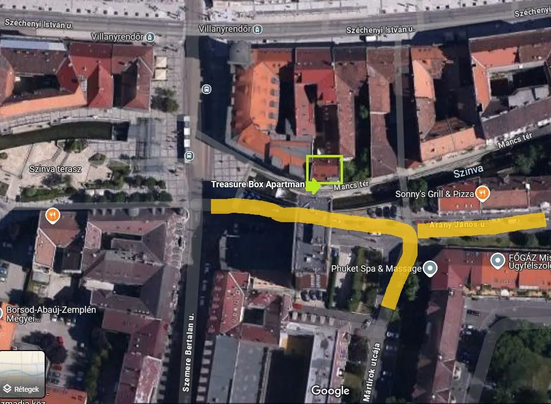 * A képen a Szinva patak felőli, vaskapus bejárat látható. Az apartman az épület jobboldalán, a 3. emeleten található.
