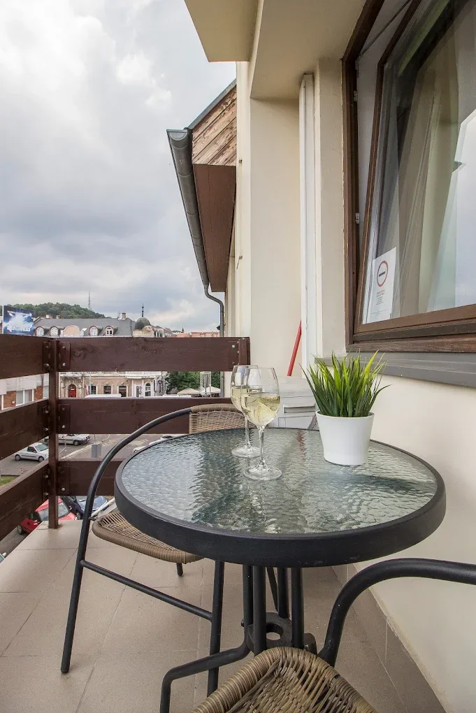 A saját terasz kényelmes bútorokkal és városi kilátással a Villanyrendőrre, tökéletes helyszín egy reggeli kávé vagy esti lazítás számára.